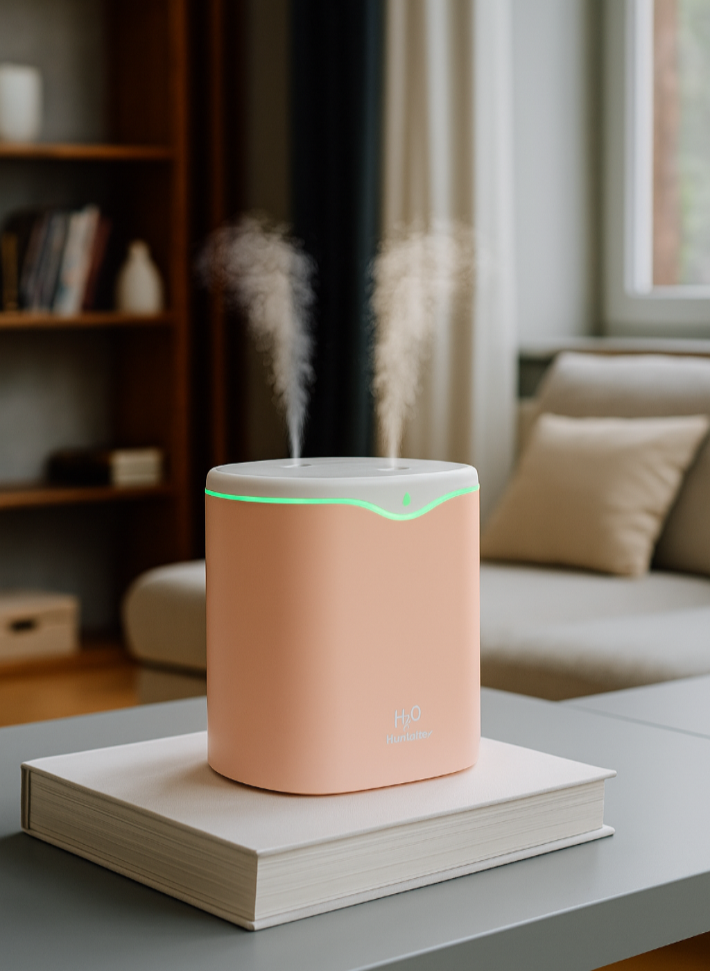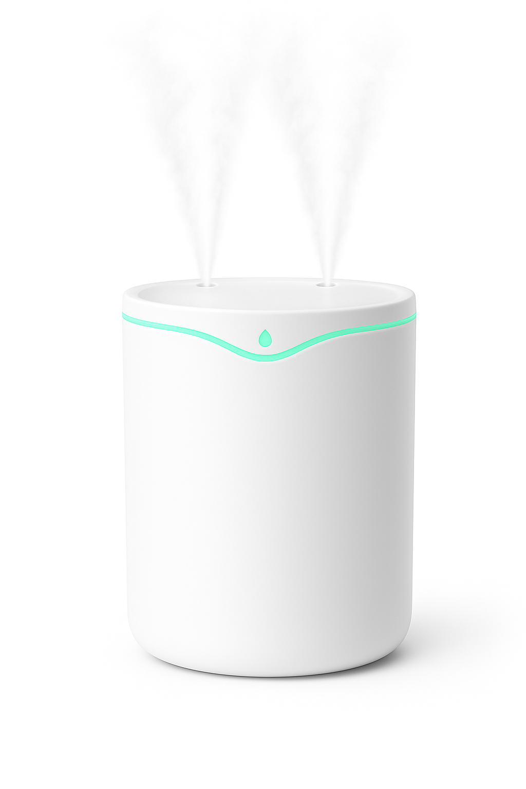 H2O Luftfuktare använder ultraljudsteknik för att sprida en fin dimma som återfuktar luften och minskar torrhet. Den har två dimmunstycken för jämn spridning och tyst drift.